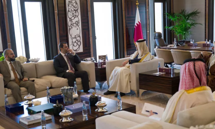 text_fieldsദോഹയിലെത്തിയ സിറിയൻ ഉന്നത സംഘം പ്രധാനമന്ത്രി ശൈഖ് മുഹമ്മദ് ബിൻ അബ്ദുർറഹ്മാൻ ആൽ ഥാനിയുമായി കൂടിക്കാഴ്ച നടത്തുന്നു