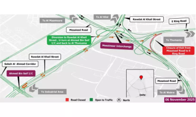 ദോഹ: അൽ വക്റയിൽനിന്ന് വരുന്നവർക്കും മിസൈമീർ ഇന്റർചേഞ്ചിലേക്ക് പോകുന്നവർക്കും മിസഈദ് റോഡ് ഇ റിങ് എക്സിറ്റ് അടച്ചിടുമെന്ന് പൊതുമരാമത്ത് വിഭാഗമായ അശ്ഗാൽ അറിയിച്ചു. ശനിയാഴ്ച പുലർച്ച രണ്ടു മുതൽ രാവിലെ എട്ടു വരെയും ഞായറാഴ്ച പുലർച്ച 12 മുതൽ പുലർച്ച അഞ്ചു വരെയുമാണ് അറ്റകുറ്റപ്പണികൾ നടത്തുന്നതിനായി റോഡ് അടച്ചിടുക. വാഹന യാത്രക്കാർ വേഗപരിധി പാലിക്കണമെന്നും ലഭ്യമായ മറ്റു പാതകൾ ഉപയോഗിക്കണമെന്നും അശ്ഗാൽ ആവശ്യപ്പെട്ടു.