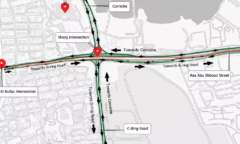 ദോഹ: ഹമദ് വിമാനത്താവളത്തിലേക്കുള്ള ജി റിങ് റോഡിലെ ഷർഖ് ഇന്റർസെക്ഷൻ പാലത്തിൽ ഗതാഗത നിയന്ത്രണം പ്രഖ്യാപിച്ച് പൊതുമരാമത്ത് വിഭാഗമായ അഷ്ഗാൽ. ആഗസ്റ്റ് 23 വെള്ളിയാഴ്ച അർധരാത്രി മുതൽ ശനിയാഴ്ച രാത്രി 11 വരെ 23 മണിക്കൂർ റോഡിൽ ഗതാഗത നിയന്ത്രണം തുടരുമെന്ന് അധികൃതർ അറിയിച്ചു. ഈ സമയം, യാത്രക്കാർക്ക് ബദൽ റോഡുകൾ ഉപയോഗിച്ച് ലക്ഷ്യ സ്ഥാനത്ത് എത്താവുന്നതാണ്. റോഡ് അടിസ്ഥാന സൗകര്യ വികസനങ്ങളുടെ ഭാഗമായാണ് നടപടി.