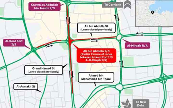 അലി ബിൻ അബ്ദുല്ല സ്ട്രീറ്റിൽനിന്നുള്ളവർ ഗ്രാൻഡ് ഹമദ് സ്ട്രീറ്റിൽനിന്നും യു-ടേൺ എടുത്തോ അല്ലെങ്കിൽ സമാന്തര പാതകൾ ഉപയോഗിച്ചോ ലക്ഷ്യസ്ഥാനങ്ങളിലേക്കെത്തണം. ഗതാഗത നിയന്ത്രണത്തോടനുബന്ധിച്ച് അടയാളങ്ങളും സിഗ്നലുകളും പദ്ധതി പ്രദേശത്ത് സ്ഥാപിക്കുമെന്നും ൈഡ്രവർമാർ വേഗപരിധി പാലിച്ച് സുരക്ഷക്ക് മുൻഗണന നൽകി ൈഡ്രവ് ചെയ്യണമെന്നും അശ്ഗാൽ അറിയിച്ചു.