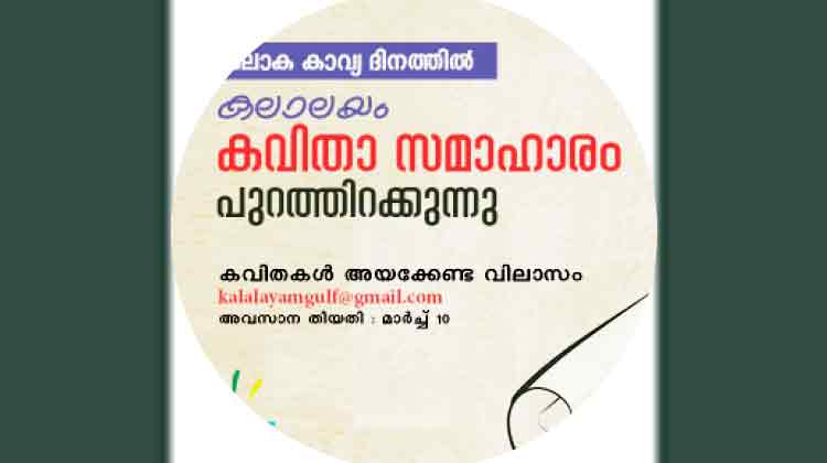 റിയാദ്: ലോക കാവ്യ ദിനത്തോടനുബന്ധിച്ച് ഗൾഫ് കലാലയം സാംസ്കാരിക വേദി നൂറു കവിതകൾ ഉൾക്കൊള്ളിച്ച് ഡിജിറ്റൽ കവിത സമാഹാരം പുറത്തിറക്കുന്നു. മലയാളത്തിൽ ടൈപ്പ് ചെയ്ത പുതിയ കവിതകൾ സ്വന്തം മേൽവിലാസത്തോടൊപ്പം kalalayamgulf@gmail.com ഇ-മെയിലിൽ അയക്കുക. തെരഞ്ഞെടുത്തവ പ്രസിദ്ധീകരിക്കും. അവസാന തീയതി മാർച്ച് 10.