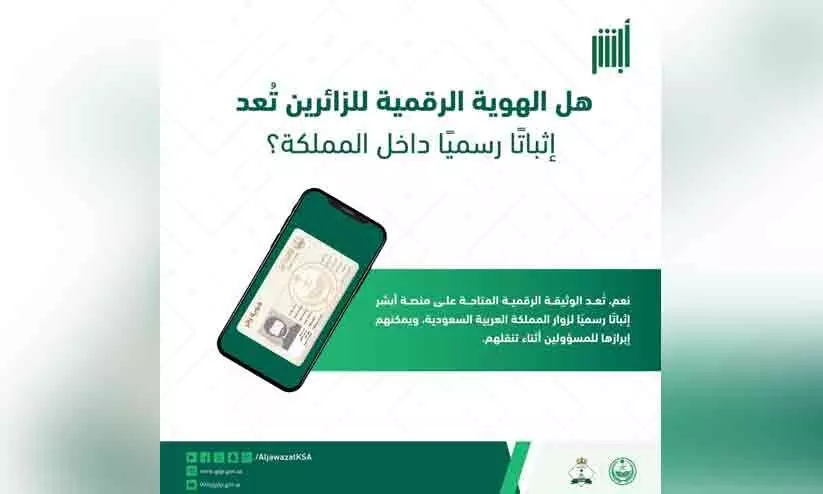 text_fieldsറിയാദ്: വിസിറ്റ് വിസയിൽ സൗദിയിലെത്തിയിട്ടുള്ളവർക്ക് തിരിച്ചറിയൽ രേഖയായി ഡിജിറ്റൽ ഐ.ഡി ഉപയോഗിക്കാമെന്ന് സൗദി പാസ്പോർട്ട് (ജവാസത്) ഡയറക്ടറേറ്റിന്റെ സ്ഥിരീകരണം. ആഭ്യന്തര മന്ത്രാലയത്തിന്റെ വ്യക്തിഗത സേവനത്തിനുള്ള ‘അബ്ശിര്’ ഡിജിറ്റൽ പ്ലാറ്റ്ഫോമിൽ ഈ ഡിജിറ്റല് ഐ.ഡി ലഭ്യമാണ്. ഇത് രാജ്യത്തെ ആധികാരികവും വിശ്വസനീയവുമായ തിരിച്ചറിയൽ രേഖയാണെന്ന് ഡയറക്ടറേറ്റ് പങ്കുവെച്ച ‘എക്സ്’ പോസ്റ്റിൽ വ്യക്തമാക്കി.