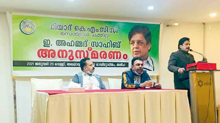 പ്രവാസികളുടെ വിവിധ പ്രയാസങ്ങൾ ചോദിച്ചു മനസ്സിലാക്കി പരിഹാരം കാണുന്നതിനും അദ്ദേഹം മുന്നിൽ നിന്ന് പ്രവർത്തിച്ചു. ഇന്ത്യൻ പാർലമെൻറിൽ പിന്നാക്ക വിഭാഗങ്ങൾക്കുവേണ്ടി ശബ്ദിച്ച ഇ. അഹമ്മദ് കർമ മണ്ഡലത്തിൽതന്നെ ജീവിതം പൊലിഞ്ഞപ്പോൾ മുസ്ലിം ലീഗിന് വലിയ നഷ്ടം സംഭവിച്ചുവെന്നും അനുസ്മരണ യോഗം വിലയിരുത്തി. യോഗം കെ.എം.സി.സി സൗദി നാഷനൽ ആക്ടിങ് പ്രസിഡൻറ് അഷ്റഫ് വേങ്ങാട്ട് ഉദ്ഘാടനം ചെയ്തു. കെ.എം.സി.സി ലീഗൽ റൈറ്റ്സ് ജനറൽ കൺവീനർ വി.കെ. റഫീഖ് ഹസൻ അനുസ്മരണ പ്രഭാഷണം നടത്തി. റിയാദ് സെൻട്രൽ കമ്മിറ്റി പ്രസിഡൻറ് സി.പി. മുസ്തഫ അധ്യക്ഷത വഹിച്ചു. സിദ്ദീഖ് കോങ്ങാട്, അബ്ദുറഹ്മാൻ ഫറോക്ക്, റസാഖ് വളക്കൈ, ഷഫീഖ് കൂടാളി എന്നിവർ സംസാരിച്ചു. സെൻട്രൽ കമ്മിറ്റി സെക്രട്ടറി ജലീൽ തിരൂർ സ്വഗതവും സഫീർ തിരൂർ നന്ദിയും പറഞ്ഞു.