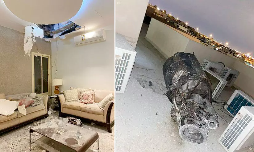 text_fields1. റിയാദിൽ ബാലിസ്റ്റിക് മിസൈൽ ആക്രമണത്തിൽ കേടുപാട് സംഭവിച്ച വീടിെൻറ ഉൾഭാഗം 2. വീടിെൻറ ടെറസിൽ വീണ മിസൈലിെൻറ ഭാഗം