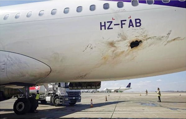 അബഹ വിമാനത്താവളത്തിൽ ഹൂതി ആക്രമണത്തിൽ തീപിടിച്ച വിമാനം