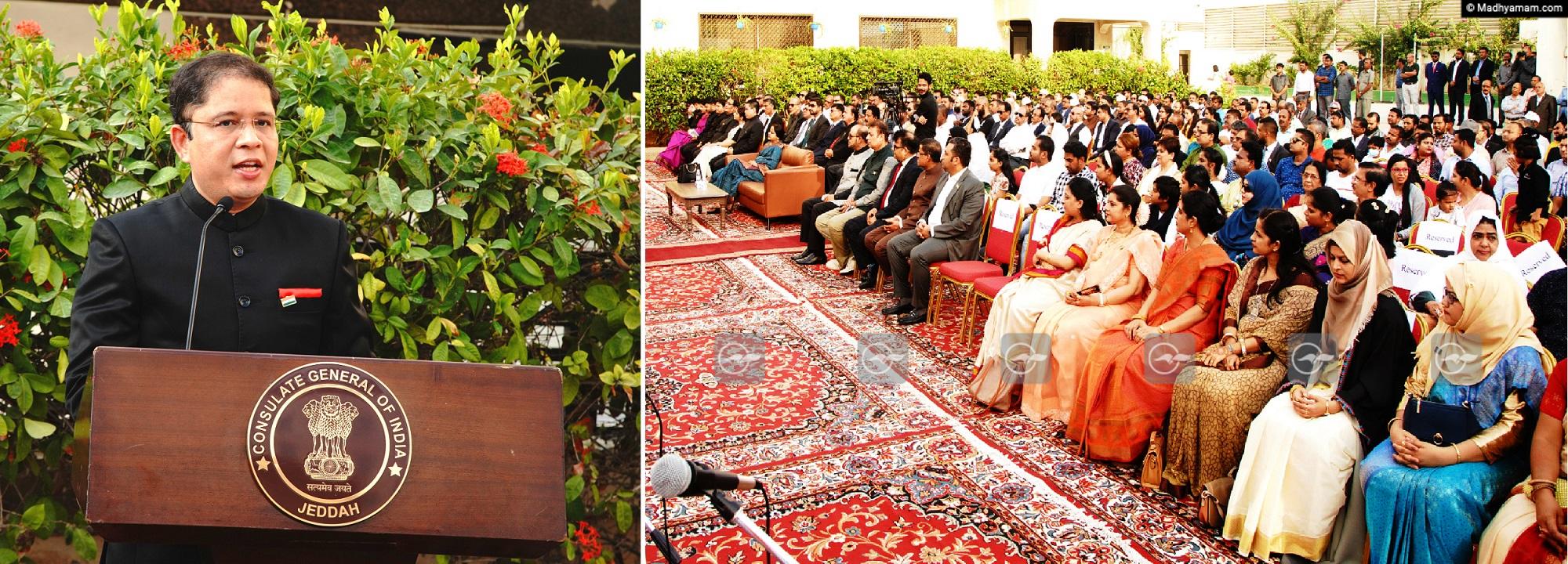 ജിദ്ദ ഇന്റര്നാഷണല് ഇന്ത്യന് സ്കൂളിലെ വിദ്യാര്ത്ഥിനികള് ദേശഭക്തി ഗാനങ്ങള് ആലപിച്ചു. ശേഷം കേക്ക് മുറിച്ച് സദസില് വിതരണം ചെയ്തു. കോണ്സുല്മാരായ വൈ. സാബിര്, ഹംന മറിയം, മുഹമ്മദ് അബ്ദുൾ ജലീൽ, മറ്റ് കോൺസുലേറ്റ് ഉദ്യോഗസ്ഥർ, സാമൂഹിക പ്രവർത്തകർ എന്നിവരോടൊപ്പം സ്ത്രീകളും കുട്ടികളുമുൾപ്പെടെ ഇന്ത്യൻ സമൂഹത്തിൽ നിന്നുള്ള നിരവധി പേരും ചടങ്ങിൽ പങ്കെടുത്തു.