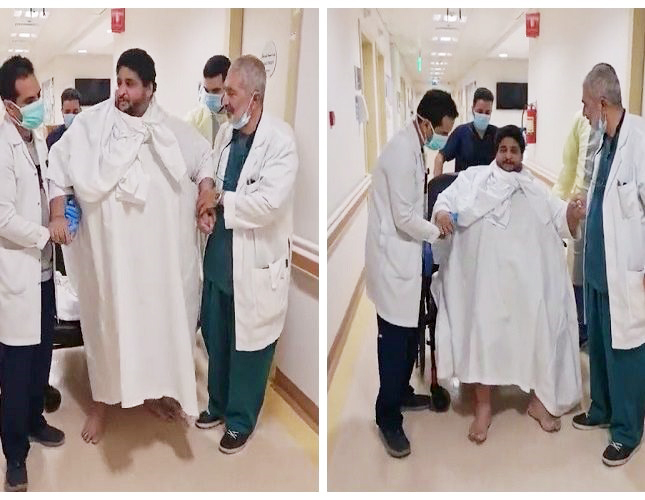 ആറുവർഷത്തോളമായി അമിതവണ്ണത്തെ തുടർന്ന് നടക്കാൻ കഴിയാതെ വിഷമിച്ചിരുന്ന യുവാവ് നീണ്ട ചികിത്സക്കൊടുവിൽ കഴിഞ്ഞ ദിവസം പതുക്കെ നടക്കാൻ തുടങ്ങി. റിയാദിലെ കിങ് സഊദ് യൂനിവേഴ്സിറ്റി ആശുപത്രിയിൽ കഴിയുന്ന മൻസൂർ അൽഷരാരി വീൽചെയറിൽനിന്ന് എഴുന്നേറ്റ് ഡോക്ടർമാരുടെ സഹായത്തോടെ നടക്കുന്ന വിഡിയോ സമൂഹ മാധ്യമങ്ങളിൽ വൈറലായി. ആറു വർഷത്തിന് ശേഷമാണ് പതിയെയെങ്കിലും നടക്കാൻ തുടങ്ങിയത്.