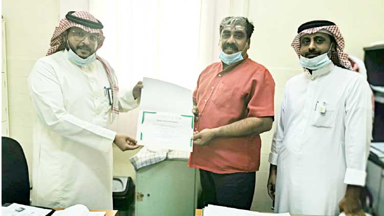 text_fieldsസൗദി ആരോഗ്യവകുപ്പ് കോവിഡ് ക്ലസ്റ്റർ സെല്ലിെൻറ അനുമോദന പത്രം മോർച്ചറി മേധാവി ഫഹദ് അൽഹാരിസ് നാസ് വക്കത്തിന് കൈമാറുന്നു
