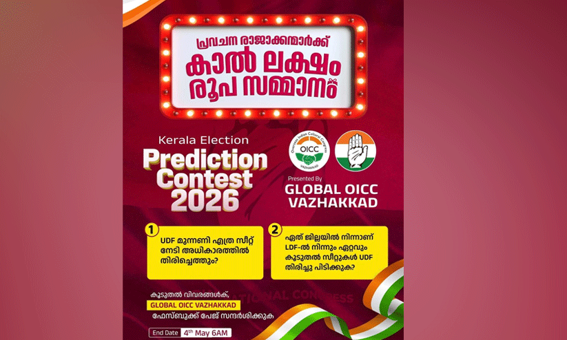 പേജിൽ നൽകിയിരിക്കുന്ന നിബന്ധനകൾ പാലിച്ച് ഉത്തരങ്ങൾ കമൻറായി രേഖപ്പെടുത്താം. വോട്ടെണ്ണൽ ദിനമായ മെയ് നാലിന് രാവിലെ ആറ് വരെയാണ് പ്രവചനങ്ങൾ അറിയിക്കാനുള്ള സമയപരിധി. മത്സരത്തിന് ഇതിനോടകം തന്നെ വലിയ ജനപങ്കാളിത്തവും പ്രതികരണവുമാണ് ലഭിക്കുന്നതെന്ന് ഗ്ലോബൽ ഒ.ഐ.സി.സി വാഴക്കാട് സെൻട്രൽ കമ്മിറ്റി ഭാരവാഹികളായ ഷബീർ അലി ദോഹ, സി.കെ. മൻസൂർ ദുബൈ, ഹർഷിദ് ചിറ്റൻ റിയാദ്, എളമരം ജൈസൽ ദോഹ, ശരീഫ് കെ.പി മസ്കറ്റ്, മീഡിയ വിങ് അംഗങ്ങളായ റിയാസ് എളമരം ദുബൈ, ശംവിൽ എളാംകുഴി ദോഹ, സ്പോൺസർ അനീഷ് കടവിൽ എന്നിവർ അറിയിച്ചു.