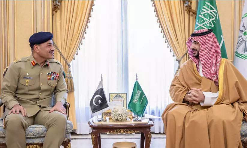text_fieldsറിയാദ്: സൗദി പ്രതിരോധ മന്ത്രി അമീർ ഖാലിദ് ബിൻ സൽമാനും പാകിസ്താൻ സൈനിക മേധാവി ജനറൽ അസിം മുനീറും റിയാദിൽ കൂടിക്കാഴ്ച നടത്തി. മേഖലയിലെ സുരക്ഷാ സാഹചര്യങ്ങളും ഇരുരാജ്യങ്ങളും തമ്മിലുള്ള പ്രതിരോധ സഹകരണവും ചർച്ച ചെയ്യുന്നതിനായിരുന്നു ഈ നിർണായക കൂടിക്കാഴ്ച. സൗദി അറേബ്യക്ക് നേരെ അടുത്തിടെ ഇറാൻ നടത്തിയ ആക്രമണങ്ങളെക്കുറിച്ചും, വർധിച്ചുവരുന്ന സംഘർഷാവസ്ഥ പരിഹരിക്കാനുള്ള മാർഗങ്ങളെക്കുറിച്ചും ഇരുനേതാക്കളും ചർച്ച ചെയ്തു. നിലവിലുള്ള സംയുക്ത പ്രതിരോധ കരാറിന്റെ ചട്ടക്കൂടിനുള്ളിൽ നിന്നുകൊണ്ട് ഇറാന്റെ നീക്കങ്ങളെ ഇരുപക്ഷവും വിലയിരുത്തി.