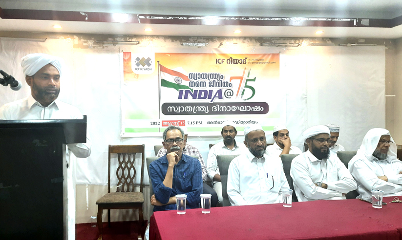 റിയാദ്: 'സ്വാതന്ത്ര്യം തന്നെ ജീവിതം' എന്ന പ്രമേയത്തിൽ ഇന്ത്യൻ കൾച്ചറൽ ഫൗണ്ടേഷൻ (ഐ.സി.എഫ്) റിയാദ് സെൻട്രലിന്റെ കീഴിൽ വിപുലമായ സ്വാതന്ത്ര്യ ദിനാഘോഷം സംഘടിപ്പിച്ചു. സെൻട്രൽ പ്രൊവിൻസ് ക്ഷേമകാര്യ സർവിസ് സെക്രട്ടറി സൈനുദ്ദീൻ കുനിയിൽ ഉദ്ഘാടനം ചെയ്തു. വിവിധ മതക്കാരും രാഷ്ട്രീയ ചിന്താഗതിക്കാരും സാമൂഹിക പ്രവർത്തകരും ഒത്തൊരുമിച്ചു പോരാടിയതിന്റെ ഫലമാണ് ഇന്ത്യൻ സ്വാതന്ത്ര്യമെന്ന് അദ്ദേഹം പറഞ്ഞു. സെൻട്രൽ അഡ്മിൻ ആൻഡ് പബ്ലിക് റിലേഷൻ പ്രസിഡന്റ് ഹസൈനാർ മുസ്ലിയാർ അധ്യക്ഷത വഹിച്ചു.