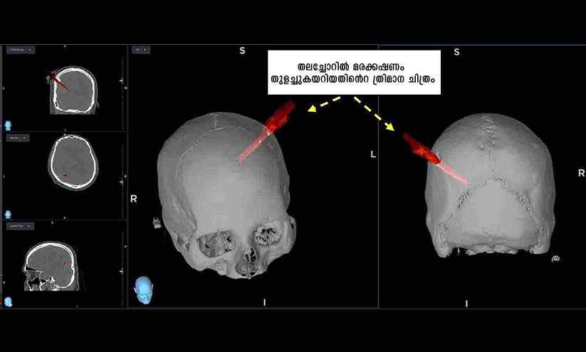 തലച്ചോറിൽ അഞ്ച് സെൻറി മീറ്റർ ആഴത്തിൽ മരക്കഷണം തറച്ചുകയറിയതായി പരിശോധനയിൽ കണ്ടെത്തി. വൈകാതെ തന്നെ ഇദ്ദേഹത്തെ അടിയന്തര ശസ്ത്രക്രിയക്ക് വിേധയനാക്കി. ആശുപത്രിയിലെ കൺസൾട്ടൻറ് ഡോ. ജോസഫ് രവീന്ദ്രൻ, ഡോ. മുഹമ്മദ് ജവാദ്, ഡോ. മിനാ മൈക്കേൽ എന്നിവരുടെ നേതൃത്വത്തിലുള്ള ന്യൂറോ സർജറി സംഘം നാല് മണിക്കൂർ നീണ്ട ശസ്ത്രക്രിയയിലൂടെ തലയോട്ടി 3-4 സെൻറീമീറ്റർ നീളത്തിൽ തുരന്നാണ് മരക്കഷണം പുറത്തെടുത്തത്.