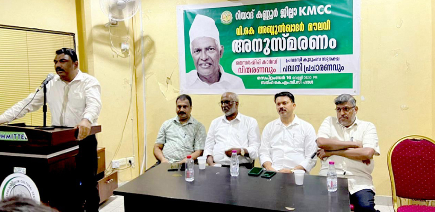 റിയാദ്: കെ.എം.സി.സി റിയാദ് കണ്ണൂർ ജില്ല കമ്മിറ്റി മുസ്ലിം ലീഗ് സംസ്ഥാന വൈസ് പ്രസിഡന്റായിരുന്ന വി.കെ. അബ്ദുൽ ഖാദർ മൗലവി അനുസ്മരണം സംഘടിപ്പിച്ചു. സൗദി കെ.എം.സി.സി ഏകീകൃത മെമ്പർഷിപ് കാമ്പയിന്റെ ഭാഗമായി ജില്ലയിൽനിന്നും ചേർത്ത അംഗങ്ങൾക്കുള്ള കാർഡുകളും വിതരണം ചെയ്തു. ജില്ല പ്രസിഡന്റ് അബ്ദുൽ മജീദ് പയ്യന്നൂർ അധ്യക്ഷത വഹിച്ചു. സെൻട്രൽ കമ്മിറ്റി പ്രസിഡന്റ് സി.പി. മുസ്തഫ പരിപാടി ഉദ്ഘാടനം ചെയ്തു. യു.പി. മുസ്തഫ മൗലവി അനുസ്മരണ പ്രഭാഷണം നടത്തി. ബാവ താനൂർ, ഉസ്മാനലി പാലത്തിങ്ങൽ, അലി വയനാട്, ജലീൽ തിരൂർ, നജീബ് നെല്ലാങ്കണ്ടി എന്നിവർ സംസാരിച്ചു.