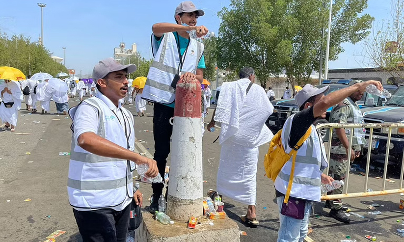 അറഫയിൽ തീർഥാടകർക്ക് ചൂടിന് ആശ്വാസമായി വെള്ളം തളിക്കുന്ന സന്നദ്ധപ്രവർത്തകർ