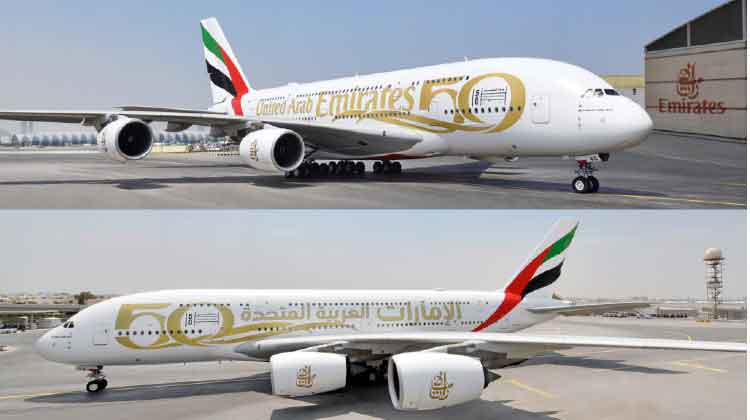 യുനൈറ്റഡ് അറബ് എമിറേറ്റ്സ് 50 എന്നാണ് വിമാനത്തിൽ വലുതായി എഴുതിയിരിക്കുന്നത്. അറബിയിലും ഇംഗ്ലീഷിലും എഴുതിയിട്ടുണ്ട്.'ഇയർ ഓഫ് 50'യുടെ ലോഗോയും പതിപ്പിച്ചിട്ടുണ്ട്.വിമാനത്തിൽ പുതിയ സ്റ്റിക്കറുകൾ പതിപ്പിക്കുന്നതിെൻറ വിഡിയോ എമിറേറ്റ്സിെൻറ സമൂഹമാധ്യമ പേജുകളിൽ പങ്കുവെച്ചു.
