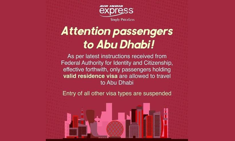 അബൂദബി: റസിഡൻറ് വിസയുള്ളവർക്ക് മാത്രമെ അബൂദബി വിമാനത്താവളത്തിലേക്ക് യാത്ര ചെയ്യാൻ അനുമതി നൽകുകയുള്ളു എന്ന് എയർ ഇന്ത്യ എക്സ്പ്രസ് അറിയിച്ചു. യു.എ.ഇ ഫെഡറൽ അതോറിറ്റി ഫോർ ഐഡൻറിറ്റിയുടെ നിർദേശ പ്രകാരമാണ് നിയന്ത്രണം.
