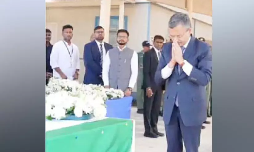 പൈലറ്റ് വിങ് കമാൻഡർ നമൻഷ് സിയാലിന്റെ മൃതദേഹത്തിൽ അന്ത്യോപചാരം അർപ്പിക്കുന്ന ഇന്ത്യൻ അംബാസഡർ ഡോ. ദീപക് മിത്തൽ