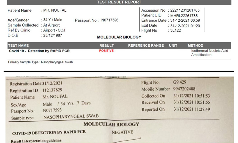 നേരെ ടാക്സി വിളിച്ച് നെടുമ്പാശ്ശേരിയിലെത്തി. രാവിലെ 10.51ന് നടത്തിയ പരിശോധന ഫലം നെഗറ്റിവ്. ഇതേതുടർന്ന് വൈകീട്ടുള്ള വിമാനത്തിൽ യു.എ.ഇയിൽ എത്തിയ നൗഫൽ ഷാർജ വിമാനത്താവളത്തിൽ നടത്തിയ പരിശോധനയിലും നെഗറ്റിവായിരുന്നു. 20ന് മെഡിക്കൽ ആവശ്യങ്ങൾക്കായി നാട്ടിൽ നടത്തിയ പരിശോധനയിലും നെഗറ്റിവായിരുന്നു ഫലം.