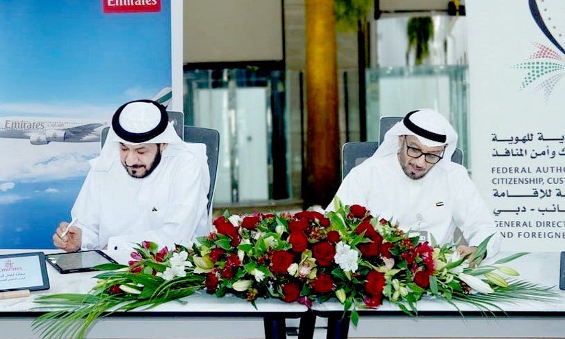 മുഹമ്മദ് അഹ്മദ് അൽ മർറിയും എമിറേറ്റ്സ് ചീഫ് ഓപറേറ്റിങ് ഓഫിസർ അദേൽ അൽ റിദയും പരസ്പര സഹകരണ കരാറിൽ ഒപ്പുവെക്കുന്നു