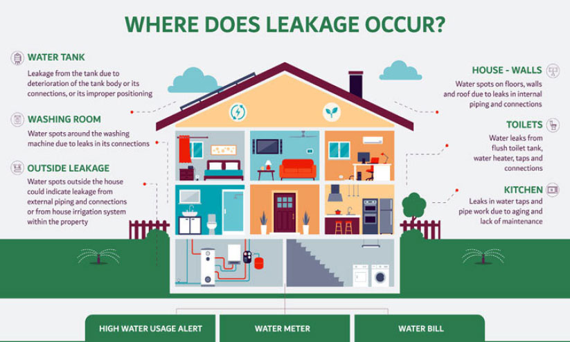 തറയിലും ചുവരിലും മേൽക്കൂരയിലും അടുക്കളയിലും വാഷിങ് മെഷീൻ പരിസരത്തുമൊക്കെ വെള്ളം ചോരാൻ സാധ്യതയുള്ള ഇടങ്ങളാണ്. പൈപ്പ് പൊട്ടിയതോ അല്ലെങ്കിൽ മതിയായ അറ്റകുറ്റപണിയില്ലാത്തതിനാൽ കണക്ഷനിൽ കേടുപാടുകൾ സംഭവിച്ചതോ ഒക്കെയാകാം ഇതിന് കാരണം. 2012ൽ ഒരു കുടുംബത്തിന്റെ അണ്ടർഗ്രൗണ്ട് പൈപ്പ് പൊട്ടിയത് കണ്ടെത്താൻ കഴിയാത്തതിനാൽ 10 ലക്ഷം ഗ്യാലൻ വെള്ളം പാഴാവുകയും അവർക്ക് 54,000 ദിർഹം പിഴ നൽകുകയും ചെയ്തിരുന്നു. 2014ൽ ഒരു കുടുംബത്തിലെ ഭൂമിക്കടിയിലെ വാട്ടർ ടാങ്ക് ചോർന്ന് രണ്ടുമാസത്തോളം ജലം പാഴാവുകയും 22,000 ദിർഹം പിഴ ഈടാക്കുകയും ചെയ്തിരുന്നു. ഇത്തരം സാഹചര്യങ്ങൾ ഒഴിവാക്കാൻ നിരന്തര പരിശോധന ആവശ്യമാണെന്ന് അധികൃതർ ചൂണ്ടിക്കാട്ടി.