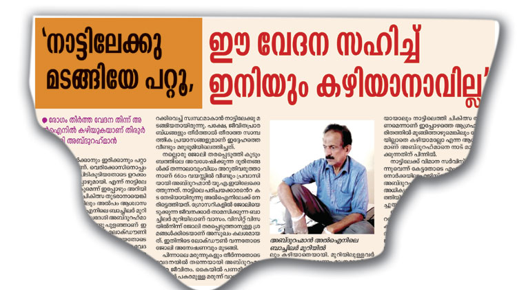 നാട്ടിലേക്ക് മടങ്ങാനാവാതെ ദുരിതത്തിൽ കഴിയുന്ന ഇദ്ദേഹത്തിെൻറ രോഗകാഠിന്യവും ജീവിതാവസ്ഥയും സന്നദ്ധ സംഘടനകൾ എംബസി അധികൃതർക്ക് മുമ്പാകെ ബോധ്യപ്പെടുത്തിയതിനെ തുടർന്നാണ് വളരെ വേഗത്തിൽ തന്നെ തിരികെ യാത്രക്കുള്ള അവസരമൊരുങ്ങിയത്. കെ.എം.സി.സി, ഐ.സി.സി, പ്രവാസി ഇന്ത്യ, ടീം തിരൂർ തുടങ്ങി നിരവധി സംഘടനകളാണ് കാരുണ്യവായ്പുകളുമായി ഇദ്ദേഹത്തിെൻറ കാര്യങ്ങളിൽ ഇടപെടാനെത്തിയത്. ഒടുവിൽ കെ.എം.സി.സി സമ്മാനിച്ച ടിക്കറ്റുമായി ശനിയാഴ്ച ഉച്ചക്കാണ് അബ്ദുറഹ്മാൻ നാട്ടിലേക്ക് തിരിച്ചത്.