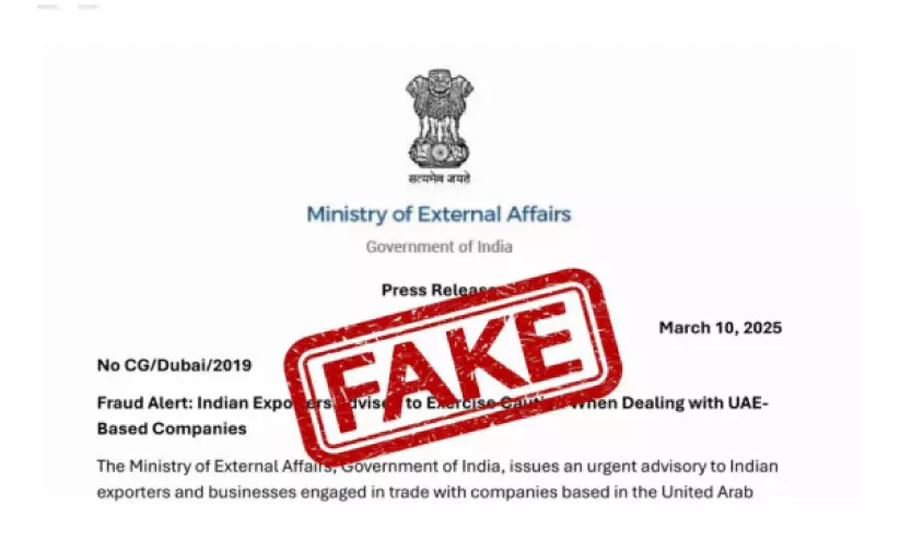 text_fieldsദുബൈ: ദുബൈ ഇന്ത്യൻ കോൺസുലേറ്റിന്റെ പേരിൽ സമൂഹ മാധ്യമങ്ങളിൽ പ്രചരിക്കുന്ന വാർത്താക്കുറിപ്പ് വ്യാജം. ഭക്ഷ്യ ഉൽപന്ന, ജനറൽ ട്രേഡിങ് മേഖലയിലെ ഇന്ത്യൻ കയറ്റുമതി വ്യാപാരികൾ യു.എ.ഇയിൽ പ്രവർത്തിക്കുന്ന ചില കമ്പനികളുമായി ഇടപാട് നടത്തുമ്പോൾ ജാഗ്രത വേണമെന്ന രീതിയിലാണ് ഇന്ത്യൻ വിദേശകാര്യ മന്ത്രാലയത്തിന്റെ പേരിൽ വാർത്താക്കുറിപ്പ് പ്രചരിക്കുന്നത്.