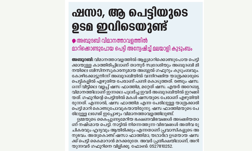 സുഹൃത്ത് നവാസിന്റെ ഉപദേശപ്രകാരം വീണ്ടും എയര്പോര്ട്ടില് പോയി അന്വേഷിച്ചപ്പോഴാണ് പെട്ടി തിരികെ എത്തിയ വിവരം അറിഞ്ഞത്. നടപടി ക്രമങ്ങള് പൂര്ത്തിയാക്കി ഷസയുടെ പെട്ടി വീട്ടിലെത്തി. ലഗ്ഗേജ് നഷ്ടപ്പെട്ട വിഷയത്തില് ഇടപെട്ട എല്ലാവര്ക്കും നന്ദി പറയുന്നതായും പ്രവാസികളുടെ വലുതും ചെറുതുമായ പ്രശ്നങ്ങള്ക്കു പരിഹാരം ഉണ്ടാവും വരെ കൂടെ നില്ക്കുന്ന മലയാളികള് എല്ലാവര്ക്കും മാതൃകയാണെന്നും ഗഫൂര് പറഞ്ഞു.