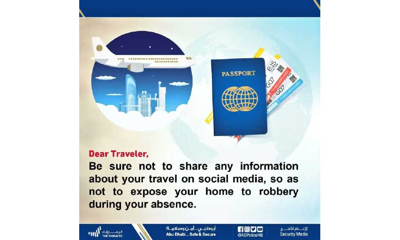 'നിങ്ങളുടെ യാത്രയെ കുറിച്ചുള്ള വിവരങ്ങൾ സമൂഹമാധ്യമങ്ങളിലൂടെ പങ്കുവെക്കുന്നില്ലെന്ന് ഉറപ്പുവരുത്തുക. നിങ്ങളുടെ അസാന്നിധ്യത്തിൽ വീട് കൊള്ളയടിക്കപ്പെടാനുള്ള സാധ്യത ഒഴിവാക്കുക' -സമൂഹമാധ്യമങ്ങളിലൂടെ അബൂദബി പൊലീസ് അറിയിച്ചു. ദുബൈ പൊലീസും സമാനമായ അറിയിപ്പുമായി രംഗത്തെത്തി. യു.എ.ഇയിൽനിന്ന് യാത്ര പുറപ്പെടുന്ന തീയതിയും മറ്റു വിവരങ്ങളും ഇൻസ്റ്റഗ്രാമിൽ പോസ്റ്റ് ചെയ്ത ഒരു സോഷ്യൽ മീഡിയ ഇൻഫ്ലുവൻസറുടെ വീട് കൊള്ളയടിക്കപ്പെട്ട സംഭവവും ഇതിന് ഉദാഹരണമായി ദുബൈ പൊലീസിലെ സൈബർ ക്രൈംസ് വിഭാഗം ഡയറക്ടർ കേണൽ സഈദ് അൽ ഹജ്രി ചൂണ്ടിക്കാട്ടി.