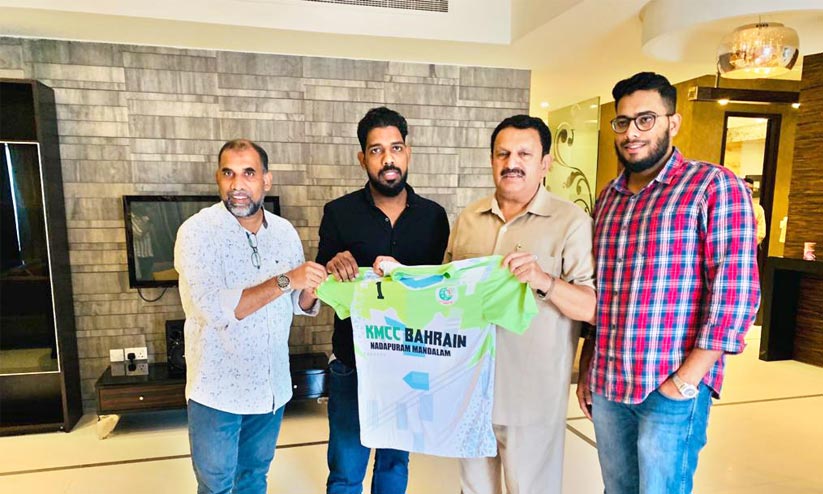 നാദാപുരം മണ്ഡലം കെ.എം.സി.സി ടീമിന്റെ ജഴ്സി ടീം ക്യാപ്റ്റൻ മുഹമ്മദ് ചെറുമോത്തിനു നൽകി കെ. മുരളീധരൻ എം.പി പ്രകാശനം ചെയ്യുന്നു
