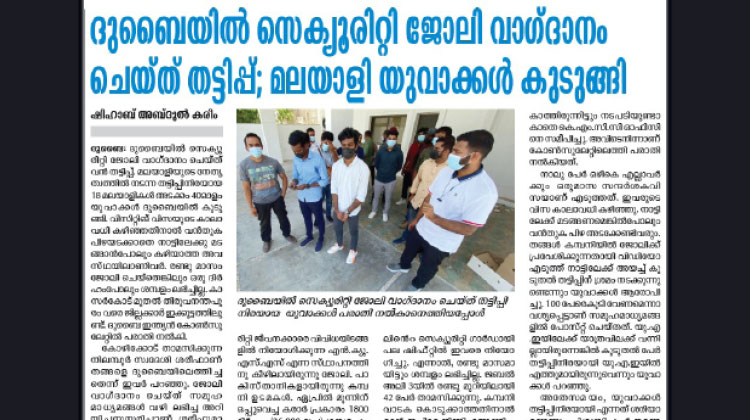 സെക്യൂരിറ്റി ജോലിവാഗ്ദാനം ചെയ്താണ് കേരളത്തിെൻറ വിവിധ ജില്ലകളിലുള്ള യുവാക്കളും ഇതര സംസ്ഥാനക്കാരും അടക്കം 40ഓളം പേരെ തട്ടിപ്പിനിരയാക്കിയത്. ലക്ഷത്തോളം രൂപ കൈപ്പറ്റിയായിരുന്നു തട്ടിപ്പ്. ചില ട്രാവൽ ഏജൻറുമാരുടെ സഹായത്തോടെയാണ് ഇവരെ വിസിറ്റ് വിസയിൽ ദുബൈയിലെത്തിച്ചത്. ഏപ്രിൽ മൂന്നിന് ഒപ്പുവെച്ചകരാർ പ്രകാരം 1800 ദിർഹം (36,000 രൂപ) ശമ്പളവും താമസവും നൽകാമെന്നായിരുന്നു വാഗ്ദാനം. സെക്യൂരിറ്റി ഗാർഡിന് സർക്കാർ നൽകുന്ന സിറ കാർഡ് കിട്ടിയാൽ 2260 ദിർഹം (45,000 രൂപ) ശമ്പളം നൽകാമെന്നും പറഞ്ഞു.
