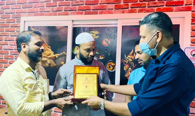 വരപ്ര മഹല്ല് പ്രവാസികളുടെ സംഗമത്തിൽ റഫീഖ് പുതിയേടത്തിന് ഉപഹാരം നൽകുന്നു