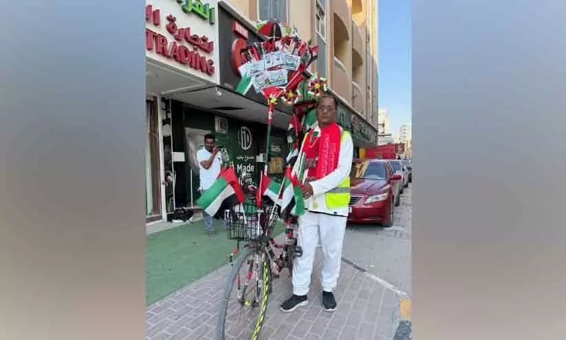 അജ്മാൻ: പോറ്റമ്മയായ രാജ്യത്തിന്റെ ദേശീയ ദിനാഘോഷത്തോടനുബന്ധിച്ച് സൈക്കിള് യാത്രയുമായി മലയാളി. യു.എ.ഇയുടെ 54ാമത് ദേശീയ ദിനാഘോഷത്തിന്റെ ഭാഗമായാണ് പാലക്കാട് മണ്ണാര്ക്കാട് അലനല്ലൂര് സ്വദേശി ഹംസ എളയോടത്ത് രാജ്യത്തിന്റെ പതാകകളാല് അലങ്കരിച്ച തന്റെ സൈക്കിളില് രാജ്യം മൊത്തം കറങ്ങാന് ഇറങ്ങിത്തിരിച്ചിരിക്കുന്നത്. അബൂദബി മുസഫയില് ജോലി ചെയ്യുന്ന ഹംസ നവംബര് ഇരുപതിനാണ് തന്റെ സാഹസത്തിന് ഇറങ്ങിയത്. സപ്തവര്ണങ്ങള് പോലെ മനോഹരമായ യു.എ.ഇയുടെ ഏഴ് എമിറേറ്റുകളും ചവിട്ടിക്കറങ്ങി എല്ലാ കാഴ്ചകളും കണ്ട് മാത്രമേ മടങ്ങിയെത്തൂ. തന്റെ യാത്രാവാഹനമായ സൈക്കിള് യു.എ.ഇയുടെ പതാകകളാല് മനോഹരമായി അലങ്കരിച്ചിരിക്കുകയാണ് ഈ മലയാളി. ലോകത്ത് ഏറ്റവും കൂടുതല് ഇന്ത്യക്കാര് ജോലി ചെയ്യുന്ന ഈ രാജ്യത്തോടുള്ള തന്റെ കടപ്പാടിന്റെ ഭാഗമായാണ് ഹംസ ഈ യാത്ര സംഘടിപ്പിക്കുന്നത്.