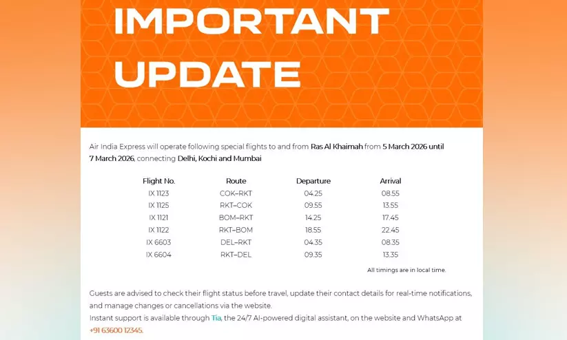മണിക്കൂറിൽ 48 വിമാനങ്ങൾക്ക് കടന്നുപോകാൻ കഴിയുന്ന രീതിയിൽ കഴിഞ്ഞ ദിവസം യു.എ.ഇ സുരക്ഷിത വ്യോമ ഇടനാഴി തുറന്നതാണ് കൂടുതൽ വിമാന കമ്പനികൾക്ക് സർവിസ് നടത്താൻ വഴിയൊരുങ്ങിയത്. എയർ ഇന്ത്യ എക്സ്പ്രസ് മാർച്ച് അഞ്ച് മുതൽ ഏഴുവരെ റാസൽഖൈമയിൽ നിന്നും തിരിച്ചും ഡൽഹി, കൊച്ചി, മുംബൈ നഗരങ്ങളിലേക്ക് പ്രത്യേക സർവിസുകൾ നടത്തും. കൊച്ചിയിൽ നിന്ന് വൈകിട്ട് 4.25ന് പുറപ്പെട്ട് 8.55 റാസൽഖൈമയിൽ എത്തും.