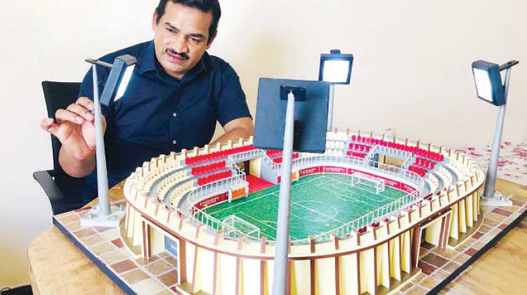 ദുബൈ: കറാമയിലെ ബാച്ലർ റൂമിൽ ഒരു 'ഫ്ലഡ്ലിറ്റ് സ്റ്റേഡിയം' ഉയരുന്നുണ്ട്. പേപ്പറും കാർഡ്ബോർഡും ഫെവികോളും ഉപയോഗിച്ച് നിർമിക്കുന്ന സ്റ്റേഡിയത്തിെൻറ അണിയറയിലുള്ളത് ഒരു മലയാളിയാണ്, മലപ്പുറം ചുള്ളിപ്പാറ സ്വദേശി മുജീബ് റഹ്മാൻ. ഏകദേശം ഒരുമീറ്റർ മാത്രം വരുന്ന സ്റ്റേഡിയത്തിെൻറ മാതൃക 100 മണിക്കൂറിെൻറ കഷ്ടപ്പാടിനൊടുവിലാണ് മുജീബ് പൂർത്തീകരിച്ചത്്. ചെലവ് 1000 ദിർഹം.