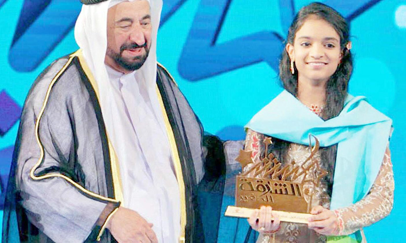 text_fields‘മുൻഷിദി’ൽ ജേതാവായ മീനാക്ഷി, ഷാർജ ഭരണാധികാരിയിൽനിന്ന് ഒന്നാം സമ്മാനം സ്വീകരിക്കുന്നു (ഫയൽ ചിത്രം)