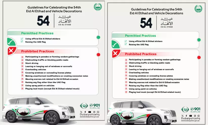 വാഹനങ്ങളുടെ മുന്നിലും പിന്നിലുമുള്ള നമ്പർ പ്ലേറ്റുകൾ മറച്ചുവെക്കുന്ന രീതിയിൽ അലങ്കരിക്കരുത്. വാഹനങ്ങളുടെ നിറങ്ങൾ, വിൻഡോ ടിന്റ് എന്നിവയിൽ മാറ്റം വരുത്താൻ പാടില്ല. കൂടാതെ ഔദ്യോഗിക ഈദുൽ ഇത്തിഹാദ് ലോഗോ ഒഴികെ മറ്റ് സ്റ്റിക്കറുകൾ ഒട്ടിക്കരുത്. റോഡുകളിൽ ഗതാഗത തടസ്സം ഉണ്ടാക്കാനോ അഭ്യാസങ്ങൾ കാണിക്കാനോ പാടില്ല. വാഹനങ്ങളിൽ കയറ്റേണ്ട യാത്രക്കാരുടെ പരിധികൾ പാലിക്കണം. സൺറൂഫിലൂടെയും വിൻഡോയിലുടെയും അഭ്യാസങ്ങൾ കാണിക്കരുത്. അമിതമായ ശബ്ദത്തിന് ഇടയാക്കുന്ന രീതിയിൽ അനുമതിയില്ലാത്ത മാറ്റങ്ങൾ വാഹനങ്ങളിൽ വരുത്താനും അനുവദിക്കില്ല. നിയമലംഘനങ്ങൾ ശ്രദ്ധയിൽപെട്ടാൽ പൊലീസ് ഐ സർവിസിലോ 901 എന്ന നമ്പറിലോ റിപ്പോർട്ട് ചെയ്യാമെന്ന് ദുബൈ പൊലീസ് അറിയിച്ചു.