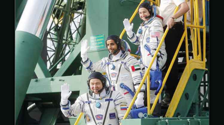 text_fieldsമേജർ ഹസ്സ അൽ മൻസൂരി, ജെസീർ മീർ, റഷ്യൻ കമാൻറർ ഒലേഗ് സ്ക്രിപ്ച്ക എന്നിവർ പേടകത്തിലേക്ക് കയറുന്നു (-ഫയൽ ചിത്രം)