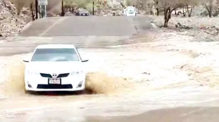 ദുബൈയിൽ ഹത്തയിലെ റോഡിൽ മഴയിൽ വെള്ളം കയറിയപ്പോൾ