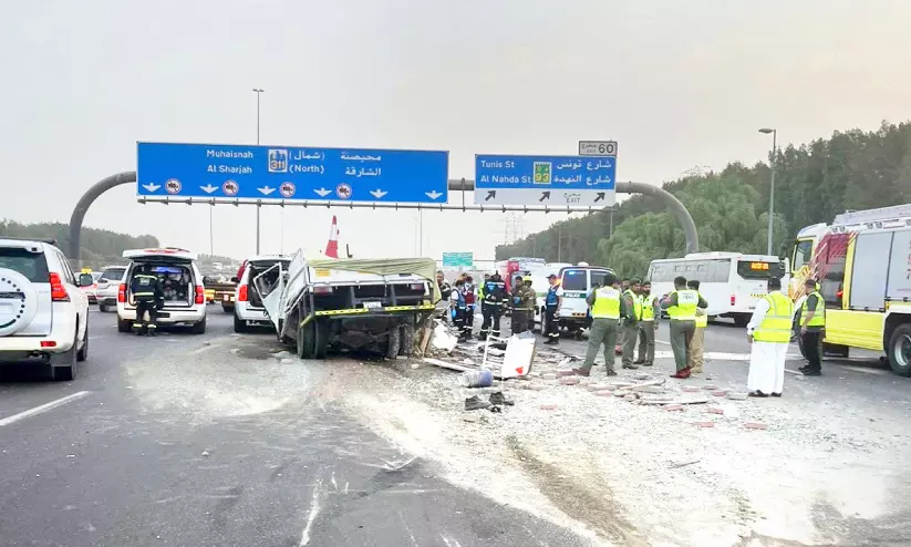 text_fieldsശൈഖ് മുഹമ്മദ് ബിൻ സായിദ് റോഡിൽ വെള്ളിയാഴ്ച പുലർച്ചെയുണ്ടായ അപകടത്തിൽ തകർന്ന ട്രക്ക്