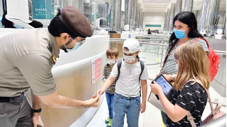 റഷ്യയിൽനിന്നുള്ള ആദ്യ ടൂറിസ്റ്റ് സംഘത്തെ ദുബൈ എയർപോർട്ടിൽ എമിഗ്രേഷൻ അധികൃതർ സ്വീകരിക്കുന്നു