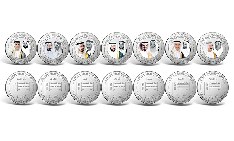 ശൈഖ് സായിദ് ബിൻ സുൽത്താൻ ആൽ നഹ്യാൻ, ശൈഖ് റാഷിദ് ബിൻ സഈദ് ആൽ മക്തൂം, ശൈഖ് ഖാലിദ് ബിൻ മുഹമ്മദ് അൽ ഖാസിമി, ശൈഖ് ഖാലിദ് ബിൻ മുഹമ്മദ് അൽ ഖാസിമി, ശൈഖ് റാഷിദ് ബിൻ ഹുമൈദ് അൽ നുഐമി, ശൈഖ് റാഷിദ് ബിൻ അഹമ്മദ് അൽ മുഅല്ല, ശൈഖ് സഖർ ബിൻ മുഹമ്മദ് അൽ ഖാസിമി, ശൈഖ് ഹമദ് അൽ ഖാസിമി തുടങ്ങിയവരുടെയും യു.എ.ഇ പ്രസിഡന്റ് ശൈഖ് ഖലീഫ ബിൻ സായിദ് ആൽ നഹ്യാന്, വൈസ് പ്രസിഡൻറും പ്രധാനമന്ത്രിയും ദുബൈ ഭരണാധികാരിയുമായ ശൈഖ് മുഹമ്മദ് ബിൻ റാഷിദ് ആൽ മക്തൂം, സുപ്രീം കൗൺസിൽ അംഗങ്ങളായ ഷാർജ ഭരണാധികാരി ശൈഖ് സുൽത്താൻ ബിൻ മുഹമ്മദ് അൽ ഖാസിമി, അജ്മാൻ ഭരണാധികാരി ശൈഖ് ഹുമൈദ് ബിൻ റാഷിദ് അൽ നുഐമി, ഫുജൈറ ഭരണാധികാരി ശൈഖ് ഹമദ് ബിൻ മുഹമ്മദ് അൽ ശർഖി, ഉമ്മുൽഖുവൈൻ ഭരണാധികാരി ശൈഖ് സൗദ് ബിൻ റാഷിദ് അൽ മുഅല്ല, റാസൽഖൈമ ഭരണാധികാരി ശൈഖ് സൗദ് ബിൻ സഖർ അൽ ഖാസിമി എന്നിവരുടെയും ചിത്രങ്ങള് ഇതിൽ ആലേഖനം ചെയ്തിട്ടുണ്ട്. ഏഴ് സ്മാരക വെള്ളി നാണയങ്ങളുടെ സെറ്റുകൾ 2021 ജനുവരി മൂന്നു മുതൽ 2000ദിർഹം എന്ന നിരക്കിൽ സ്റ്റോക്ക് തീരുന്നതുവരെ സെന്ട്രല് ബാങ്ക് ആസ്ഥാനത്തും ശാഖകളിലും വിൽപനക്ക് ലഭ്യമാകും.