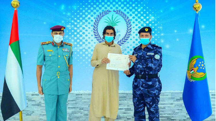 കുറ്റവാളിയെ പിടികൂടാൻ സഹായിച്ചയാളെ പൊലീസ് കമാൻഡർ- ഇൻ-ചീഫ് മേജർ ജനറൽ സൈഫ് അൽ സഅരി അൽ ഷംസി ആദരിച്ചപ്പോൾ