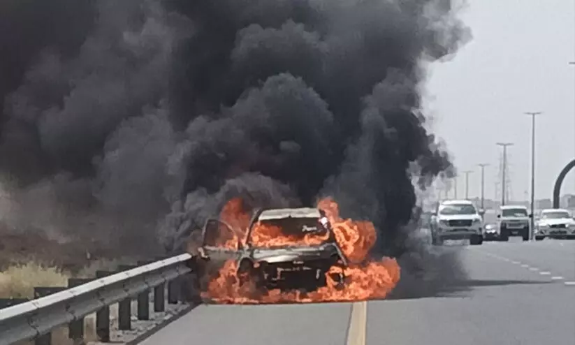 മിനുറ്റുകള്ക്കകം കാര് പൂര്ണമായും കത്തിയമര്ന്നു. കച്ചവട ആവശ്യാര്ഥം ഒമാനില് നിന്നും ദുബൈയിലേക്ക് വന്നതായിരുന്നു മൂന്ന് പേര് അടങ്ങുന്ന മലയാളികളായ യാത്രാ സംഘം. വിവരമറിഞ്ഞ് അഗ്നിശമന വിഭാഗം ഉടന് സ്ഥലത്തെത്തി തീ നിയന്ത്രണ വിധേയമാക്കി. സിയൂഹ് പൊലീസ് സ്റ്റേഷന് പരിധിയിലാണ് സംഭവം നടന്നത്. തുടര് നടപടികള് പുരോഗമിക്കുകയാണ്.