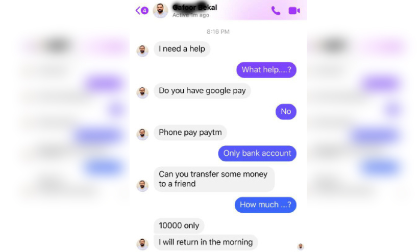 ഇദ്ദേഹത്തിന്റെ സുഹൃത്തുക്കളോട് 10,000 രൂപ വരെയാണ് സംഘം ആവശ്യപ്പെട്ടിരുന്നത്. ഉടനെ അയക്കണമെന്നും നാളെ രാവിലെ മടക്കി അയച്ചു തരാമെന്ന മോഹന വാഗ്ദാനവും സംഘം തങ്ങളുടെ ഇരകളോട് പങ്ക് വെക്കുന്നുണ്ട്. ഇത്തരം സംഭവങ്ങള് ആവര്ത്തിക്കുന്നത് കൂടുതലായതോടെ യഥാര്ഥ പ്രൊഫൈലുകളെ പോലും സംശയത്തോടെ സ്വീകരിക്കേണ്ട അവസ്ഥയാണ് സമൂഹ മാധ്യമ ഉപയോക്താക്കള്ക്ക്