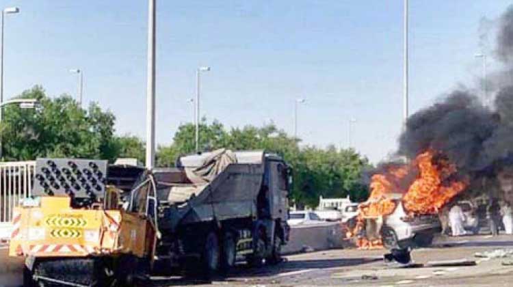 റാസൽഖൈമയിലുണ്ടായ അപകടത്തിൽപെട്ട കാർ തീ പിടിച്ച് കത്തിയപ്പോൾ