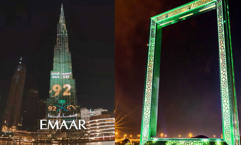 ബുർജ് ഖലീഫ, ബുർജ് അൽ അറബ്, ഐൻ ദുബൈ, ദുബൈ ഫ്രെയിം തുടങ്ങിയവ ആശംസയറിയിച്ച് സൗദി പതാകയാൽ തിളങ്ങി. യു.എ.ഇയുടെയും സൗദിയുടെയും സൗഹൃദം വരച്ചുകാണിക്കുന്നതായിരുന്നു ഇവിടെ നടന്ന ലൈറ്റ് ഷോ.