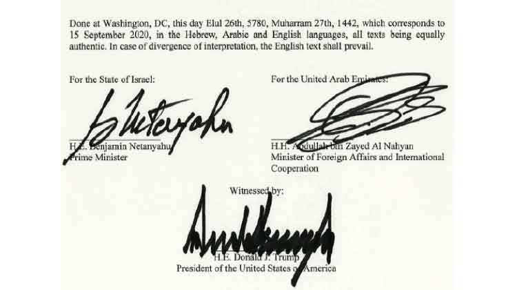 ദുബൈ: യു.എ.ഇയും ഇസ്രായേലും തമ്മിൽ ഒപ്പുവെച്ച സമാധാന കരാറിെൻറ ഉള്ളടക്കം പുറത്തുവിട്ടു. 'അബ്രഹാം ഉടമ്പടി' എന്നു പേരിട്ട കരാറിൽ പശ്ചിമേഷ്യയുടെ സുരക്ഷക്കാണ് പ്രാധാന്യമെന്നു പറയുന്നു.തീവ്രവാദത്തിനെതിരെ പോരാടുന്നതിനായി പശ്ചിമേഷ്യക്കായി പ്രത്യേക നയം രൂപവത്കരിക്കും. ഇക്കാര്യത്തിൽ യു.എസുമായി ചേർന്ന് പ്രവർത്തിക്കും. തീവ്രവാദത്തിനും പൊതുശത്രുക്കൾക്കുമെതിരെ പ്രതിരോധിക്കുന്നതിന് സഹകരിക്കും.