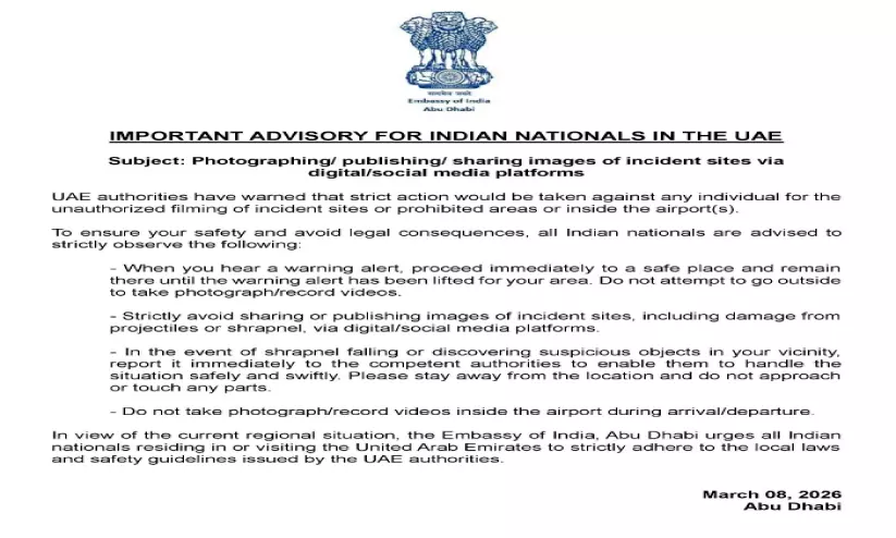 text_fieldsദുബൈ: സംഘർഷ സാഹചര്യങ്ങളിൽ വീഡിയോ ചിത്രീകരിക്കുന്നതും ഫോട്ടോ പകർത്തി സമൂഹ മാധ്യമങ്ങളിൽ പങ്കുവെക്കുന്നതും ഗുരുതരമായ നിയമനപടികളിലേക്ക് നയിക്കുമെന്ന് മുന്നറിയിപ്പുമായി ഇന്ത്യൻ എംബസി. യു.എ.ഇയുടെ നിയമ നിർദേശങ്ങൾ കർശനമായി പാലിക്കാൻ പ്രവാസികൾ ബാധ്യസ്ഥരാണ്. അടിയന്തര സാഹചര്യങ്ങളിൽ മുന്നറിയിപ്പ് സന്ദേശങ്ങൾ വരുമ്പോൾ സുരക്ഷിമായ സ്ഥലങ്ങളിലേക്ക് മാറുകയും സന്ദേശം പിൻവലിക്കുന്നത് വരെ തുടരുകയും ചെയ്യണം. സംഭവങ്ങളുടെ ചിത്രങ്ങളും വീഡിയോകളും പകര്ത്തുന്നതിന് പുറത്തേക്ക് പോകാന് ശ്രമിക്കരുത്. സംഭവ സ്ഥലങ്ങളുടെയും മിസൈല് ഭാഗങ്ങളുടെയും നാശനഷ്ടങ്ങളുടെയും ചിത്രങ്ങള്, വീഡിയോകള് തുടങ്ങിയവ സാമൂഹിക മാധ്യമങ്ങളിലൂടെയും ഡിജിറ്റല് പ്ലാറ്റ്ഫോമുകളിലൂടെയും പങ്കുവെക്കുന്നത് കര്ശനമായി ഒഴിവാക്കണം.
