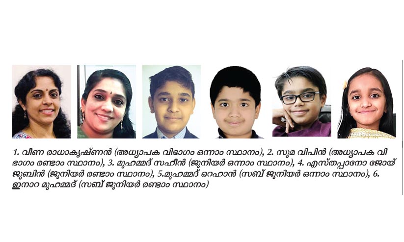 മത്സരത്തിൽ അധ്യാപക വിഭാഗത്തിൽ വീണ രാധാകൃഷ്ണനും വിദ്യാർഥികളിൽ ജൂനിയർ വിഭാഗത്തിൽ മുഹമ്മദ് സഹീനും സബ്ജൂനിയർ വിഭാഗത്തിൽ മുഹമ്മദ് െറഹാനും ഒന്നാം സമ്മാനാർഹരായി. അധ്യാപക വിഭാഗത്തിൽ സുമ വിപിൻ രണ്ടാം സ്ഥാനം നേടി.