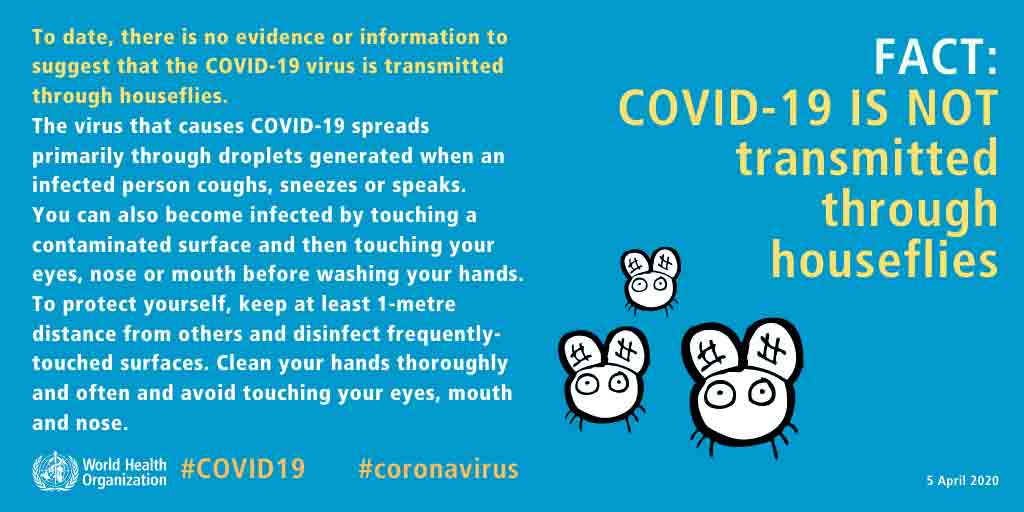 വീടിനകത്തും പുറത്തുമെല്ലാം സാധാരണയായി കാണുന്ന ഈച്ചകൾ കോവിഡ് പടർത്തുന്നു എന്ന വാദവും തെറ്റാണ്. മറ്റ് ചില അസുഖങ്ങൾ ഇവ പടർത്തുമെങ്കിലും ഈച്ച കോവിഡ് പടർത്തിയതായി ലോകത്തെവിടെയും റിപ്പോർട്ട് ചെയ്തിട്ടില്ലെന്നാണ് വാസ്തവം. ഒരു കോവിഡ് ബാധിതൻ ചുമയ്ക്കുമ്പോഴോ തുമ്മുമ്പോഴോ സംസാരിക്കുമ്പോഴോ പുറത്തുവരുന്ന സ്രവ കണങ്ങളിലൂടെയാണ് പ്രധാനമായും കോവിഡ് പകരുന്നത്. വൈറസ് നിലനിൽക്കുന്ന പ്രതലത്തിൽ തൊട്ട കൈ കൊണ്ട് മുഖത്തോ കണ്ണിലോ വായിലോ തൊടുന്നതും കോവിഡ് പകരാൻ കാരണമാകും.